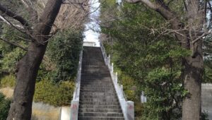 神社は高い階段の上にあり、